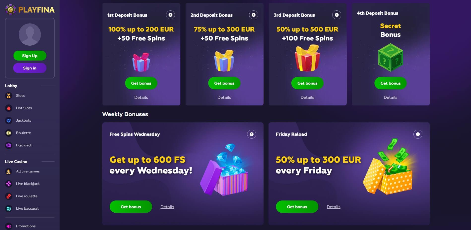 To start playing your favorite games at Playfina, you must create a personal account. After that, you can access all the site's functionality Discover the Seamless Ease of Playfina Login! Playfina Casino Review - No Deposit, Free Spins And Best Playfina Casino How to Start Up to 1000€ + 200 FS + Secret Bonus!!! You instantly get presented with the casino's primary services and listed games, as well as its live casino section...