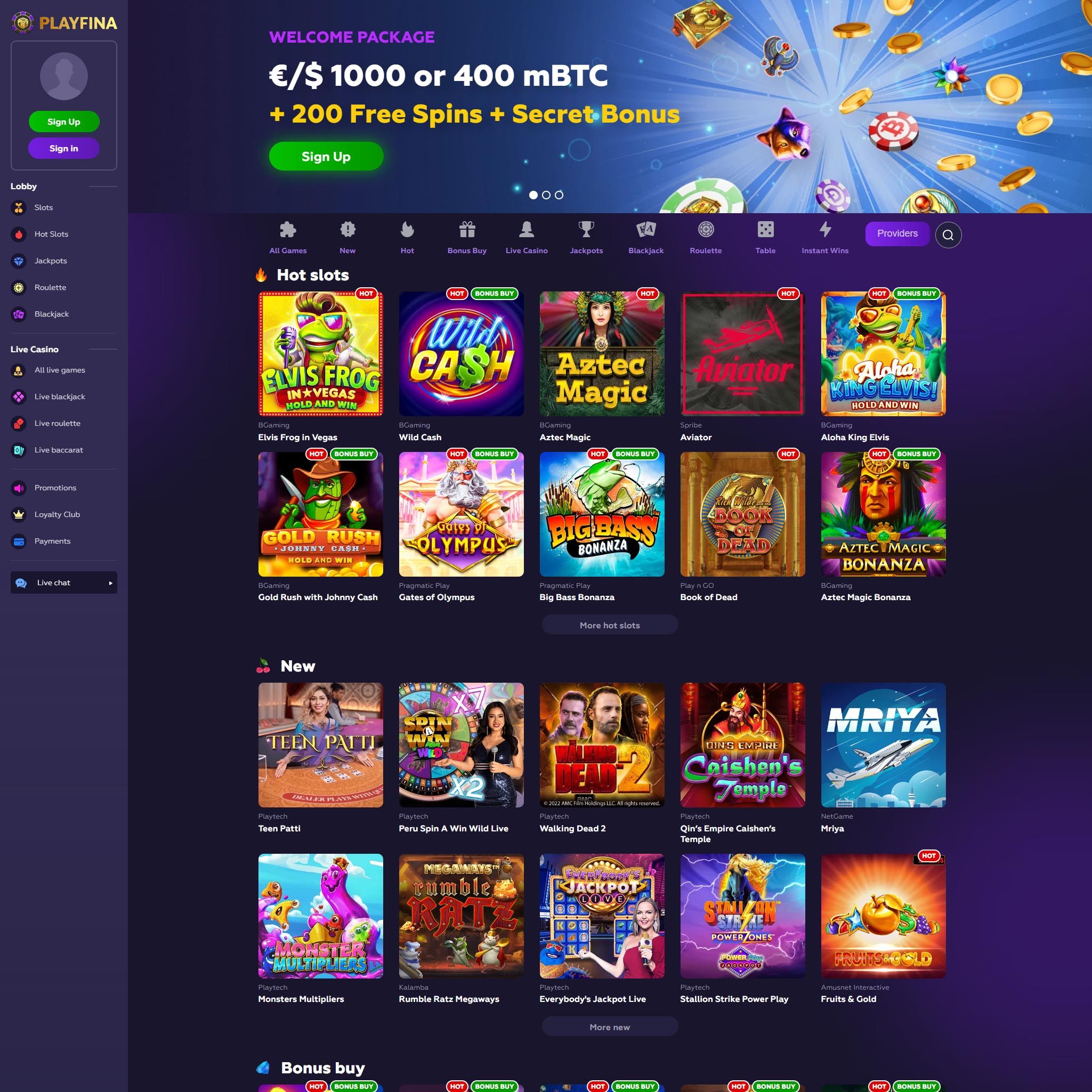 More than 11,000 slots, all varieties of blackjack, dozens of roulette games, craps, video poker, and other games are available to you at Playfina casino online Unleash the Full Potential of Your Gaming Adventure - Unlock Unbeatable Rewards with Playfina Promo Codes! Play the Best Online Casino Games at Playfina ✓ Try Slots, Blackjack, Roulette, Craps and Video Poker with Huge Bonuses. Playfina Casino How to Start Up to 1000€ + 200 FS + Secret Bonus... Playfina Casino - Bonus Codes – 50 Free Spins!